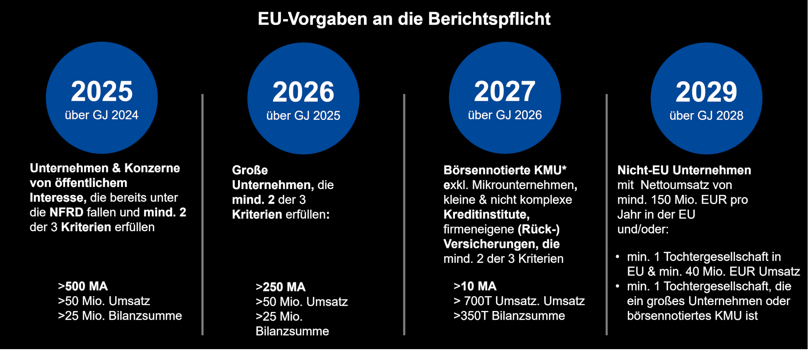 Die Berichterstattung der „cross-cutting“ Standards sowie der ESRS E1 „Climate Change“ und ESRS S1 „Own Workforce“ ist für alle Unternehmungen verpflichtend. Alle weiteren Standards sind dann zu berichten, wenn diese für das Unternehmen als maßgeblich zu betrachten sind.